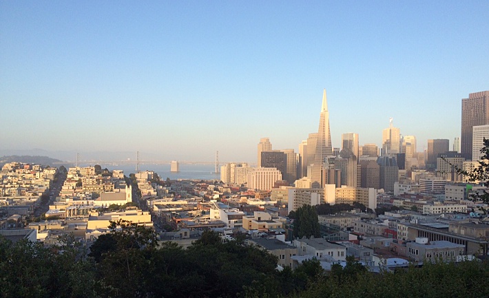 С вершины Русского холма открывается невероятный вид на даунтаун и мост через бухту Сан-Франциско.