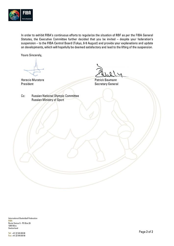 Письмо ФИБА в адрес РФб об отстранении сборных