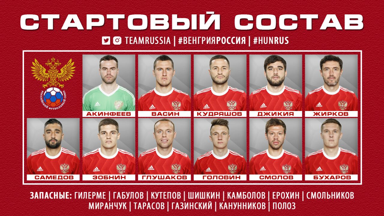 Акинфеев – Васин, Кудряшов, Джикия – Зобнин, Глушаков – Самедов, Головин, Жирков – Бухаров, Смолов.