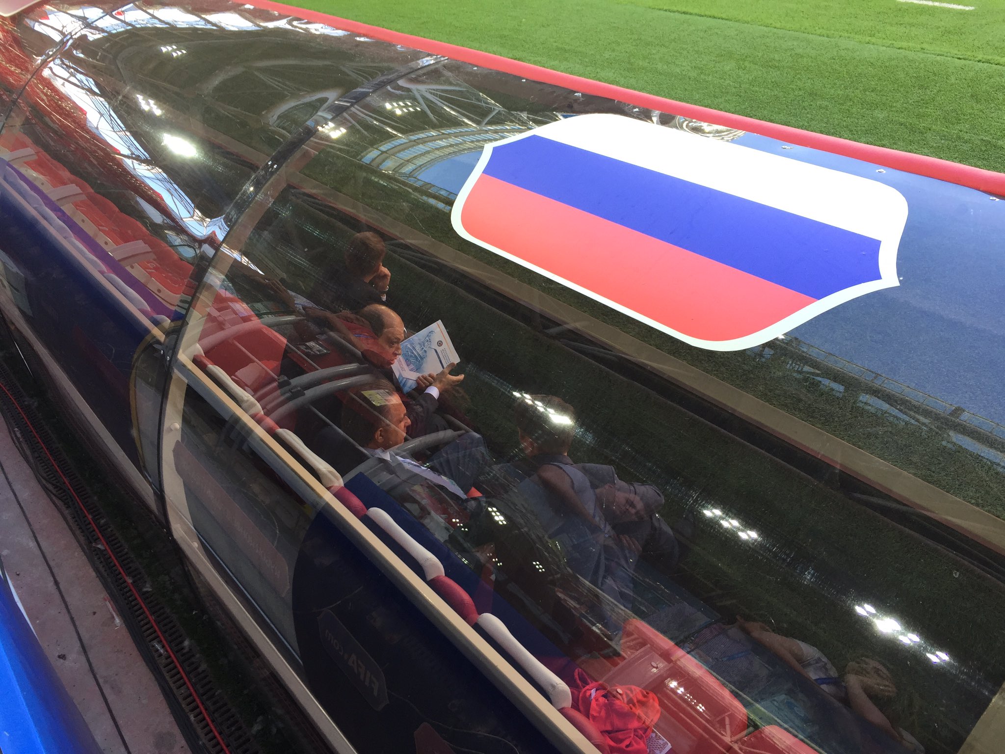 На скамейке запасных с российским флагом на крыше сидят Сергей Прядкин и Виталий Мутко.