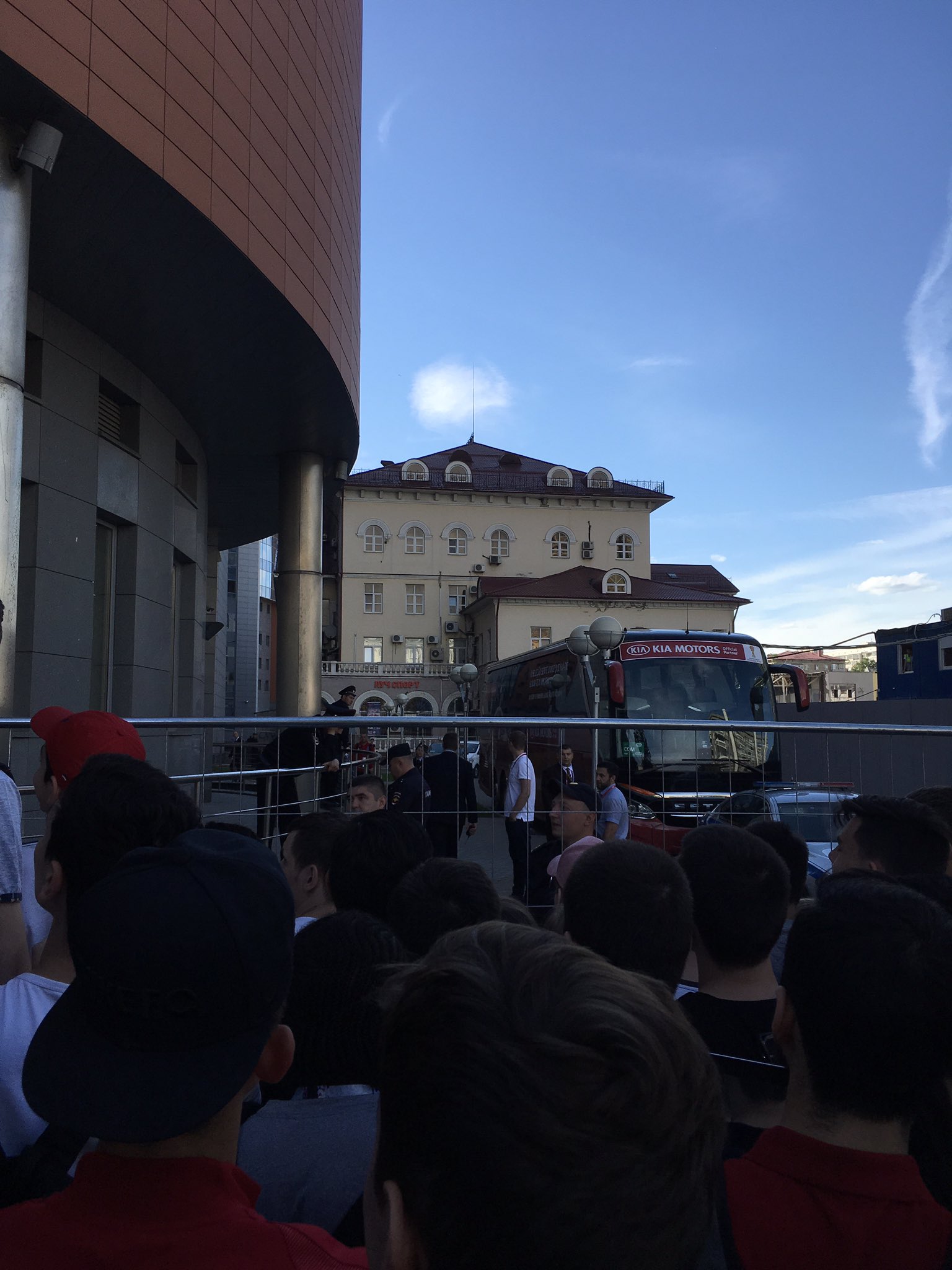 У отеля, где расположились чемпионы Европы, столпилось более сотни человек. Причём одна часть стояла у главного входа, а вторая ближе к автобусу, на котором европейские футболисты отправились на тренировку. Не остались в стороне и работники соседней от отеля стройки, который также следили за выходом игроков.