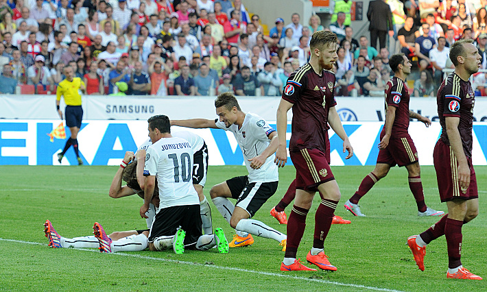 Дальше Австрия ответила ударом в упор едва вышедшего на замену Забитцера: Акинфеев смог отразить мяч лишь... коленями, а от Арнаутовича мяч отскочил не в ворота, а за лицевую. Повезло.