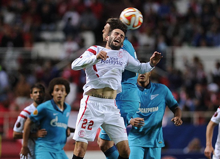 Четверг. Севилья. "Севилья" – "Зенит" – 2:1. В борьбе за верховой мяч защитник питерцев Милан РОДИЧ и хавбек испанцев АЛЕЙШ ВИДАЛЬ. Фото - AFP
