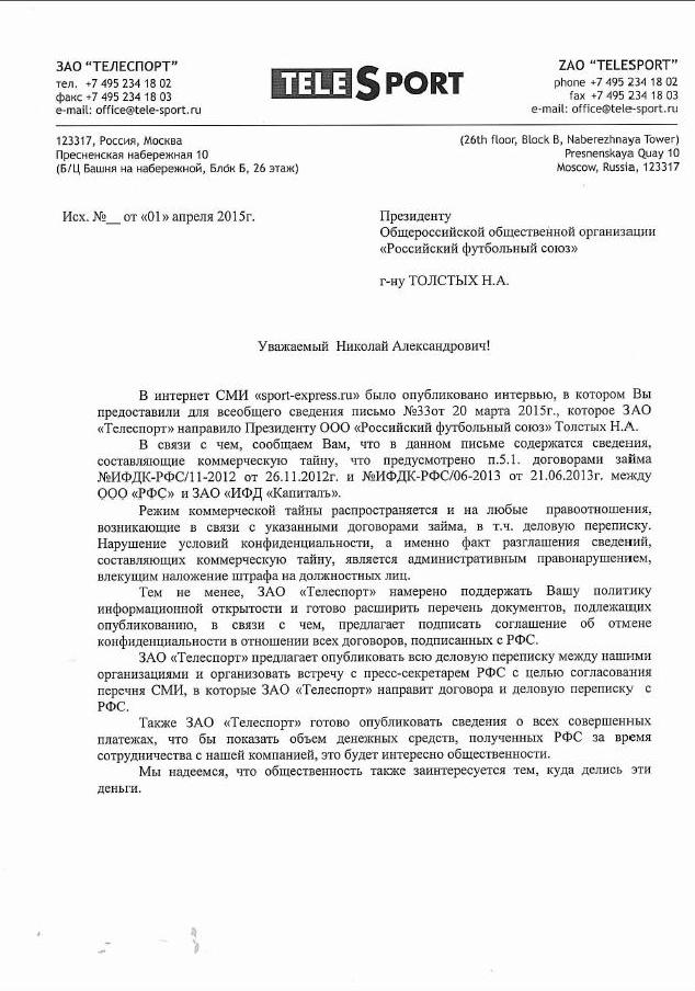 Поводом для заявления послужило письмо от компании "Телеспорт", которое, по словам Толстых, пришло в РФС 26 марта, хотя датировано 20-м. В письме сообщалось, что "ИФД КапиталЪ" передал "Телеспорту" право требовать с РФС давний долг в размере 210 миллионов рублей плюс проценты за пользование этим займом (в общей сложности – порядка 300 миллионов).