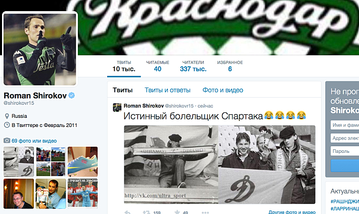 Полузащитник "Краснодара" Роман Широков саркастично ответил на слова владельца "Спартака" Леонида Федуна и выложил в своем твиттере фотографии. На них изображен руководитель красно-белых, поддерживающий киевское "Динамо".