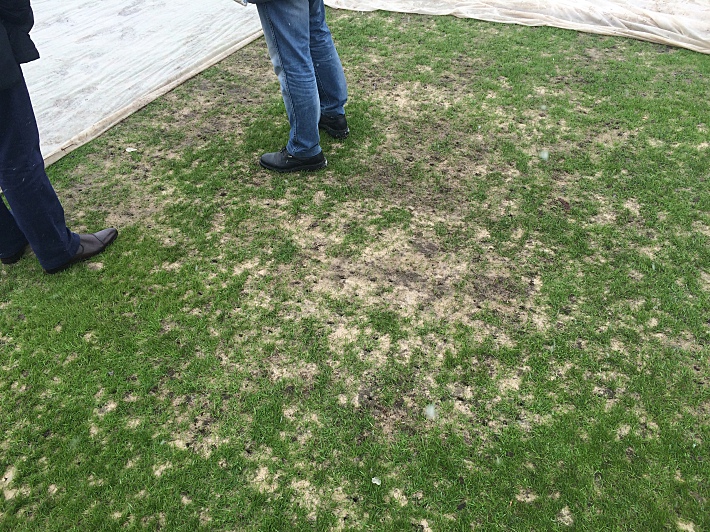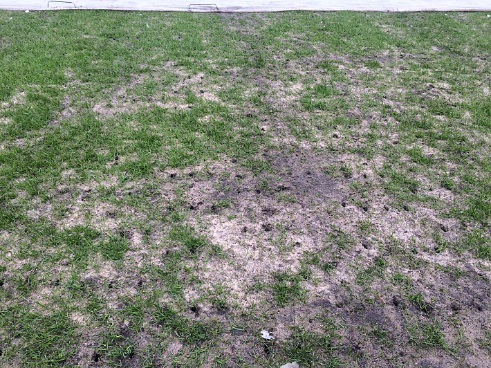 "Футбольное поле в основном ровное. Травяной покров неравномерный. Имеются проплешины по полю. Температура на глубине 10 см плюс 15 градусов, что является недостаточным для устойчивого роста травы. Корневая система травы неглубокая. Дернина травяного покрова формируется в соответствии с погодными условиями. На отдельных участках отмечены неустойчивость газона к сдвигам. Подсев травы в должном объеме не проведен".