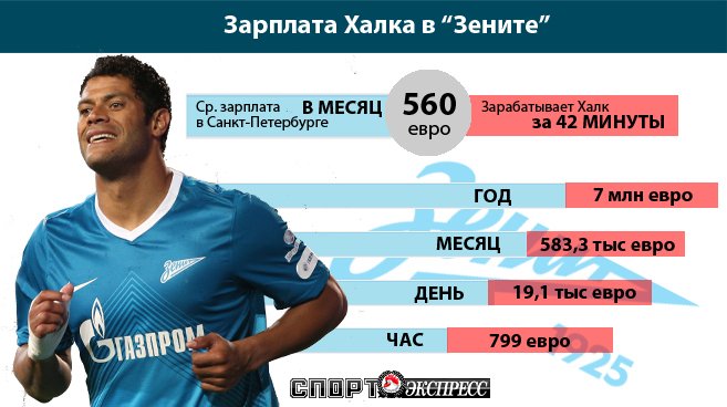По данным "СЭ", зарплата нападающего не выросла ни на евроцент. Что вряд ли является для него проблемой, потому что за два дополнительных года он станет богаче еще приблизительно на 14 миллионов евро. В час Халк зарабатывает примерно 800 евро, в день – около 18 тысяч.