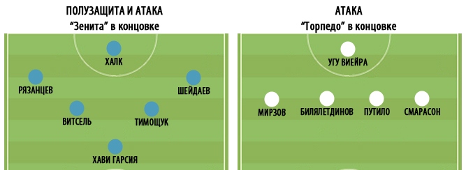 Но если этот ход Петракова можно было предположить, то другие перестановки стали сюрпризом. На скамейку довольно неожиданно отправились Билялетдинов и Мирзов, уступив место на поле Салугину и Путило. Что до "Зенита", то Андре Виллаш-Боаш, которого за неимением претензий к результатам и качеству игры его команды упрекали в нежелание проводить привычную для выступлений на два фронта активную ротацию состава, изменять себе не стал. Португалец по сравнению с матчем против "Торино" ограничился косметической заменой, усадив на лавку Данни и бросив в бой здорово сыгравшего с "Уралом" Рязанцева. Тогда он подменял приболевшего Халка и действовал на правом фланге атаки. Теперь же расположился в центре поля над опорниками Витселем и Хави Гарсия.