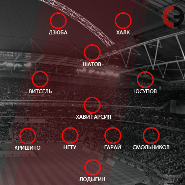 "Зенит" (Санкт-Петербург): 1. Лодыгин, 19. Смольников, 24. Гарай, 13. Нету, 4. Кришито (к), 21. Хави Гарсия, 14. Юсупов (20. Файзулин, 61), 28. Витсель (10. Данни, 74), 17. Шатов, 7. Халк, 22. Дзюба (92. Долгов, 81).