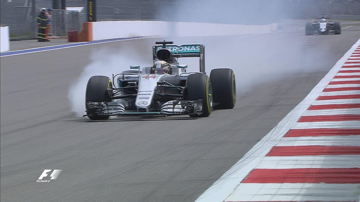Хэмилтон "теряет" машину при выходе из четвертого поворота и вылетает с трассы. Желтые флаги. Слишком увлекся виртуальной борьбой, видимо.