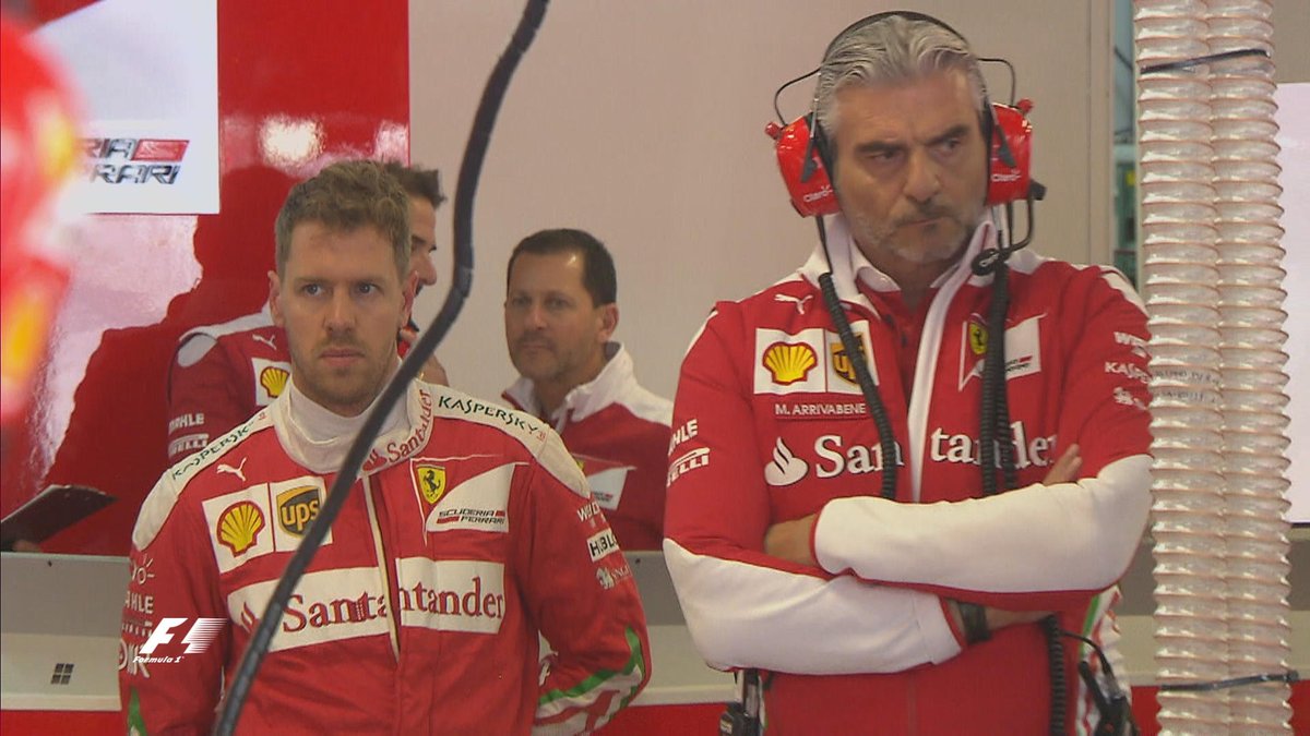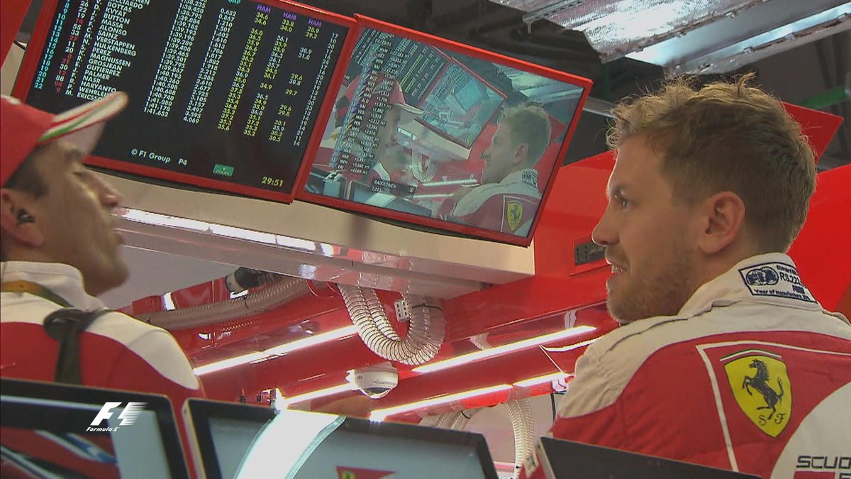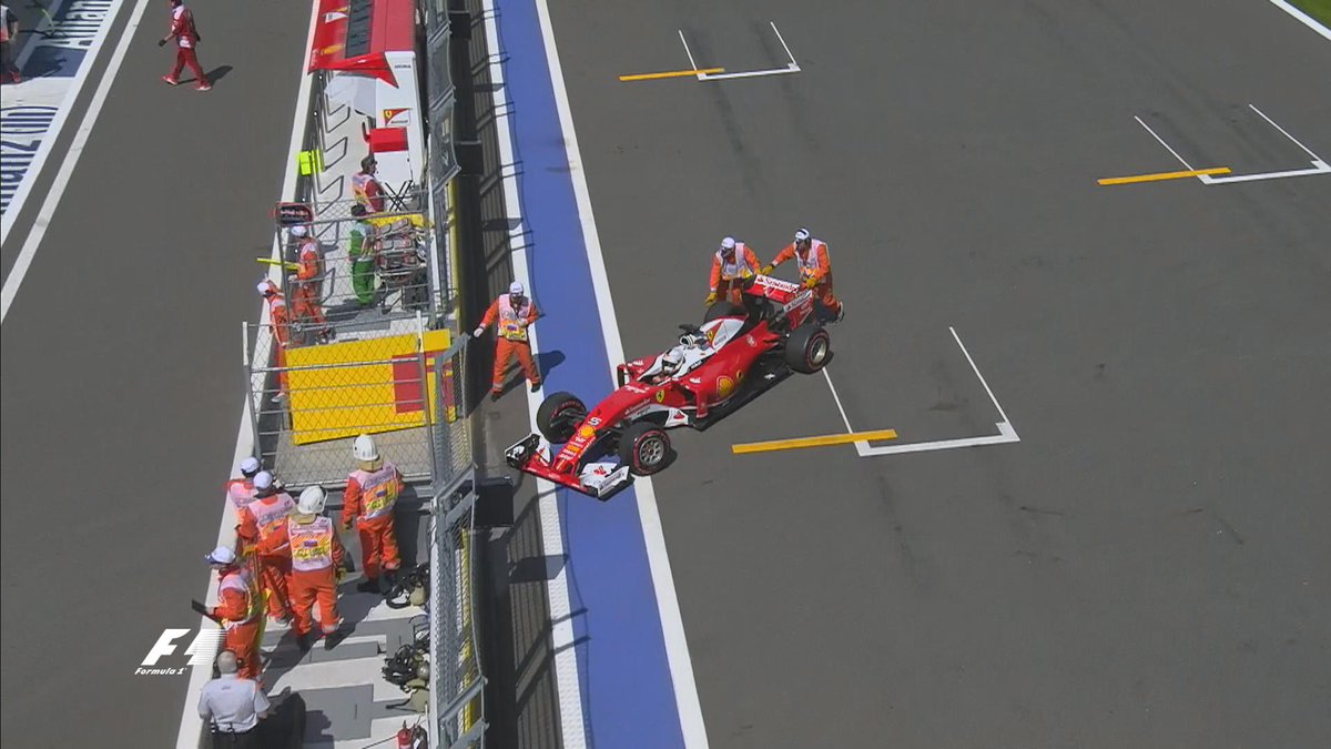 Болид Феттеля спешно откатывают в боксы. Команде предстоит решить непростую задачу и "оживить" машину. Есть риск потерять много времени.