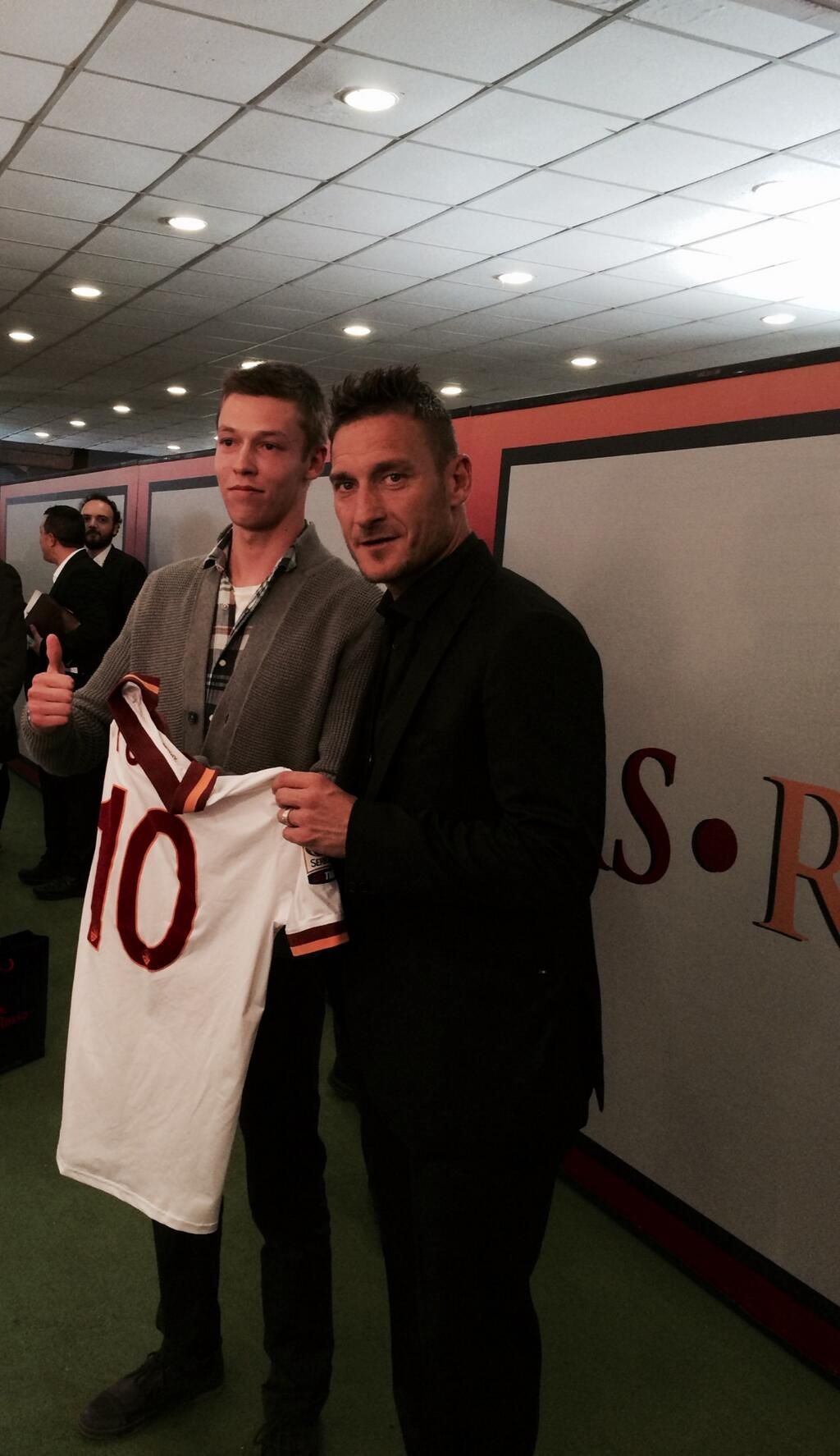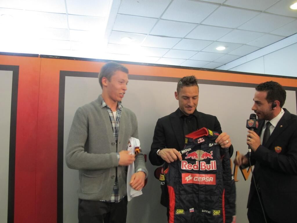Нападающий "Ромы" Франческо Тотти подарил свою футболку российскому пилоту "Торо Россо" Даниилу Квяту, информирует официальный твиттер римского клуба. Гонщик, которому сегодня исполнилось 20 лет, вчера присутствовал на матче 35-го тура чемпионата Италии "Рома" – "Милан" (2:0). Сам Квят подарил Тотти гоночный комбинезон, за что в ответ получил футболку.