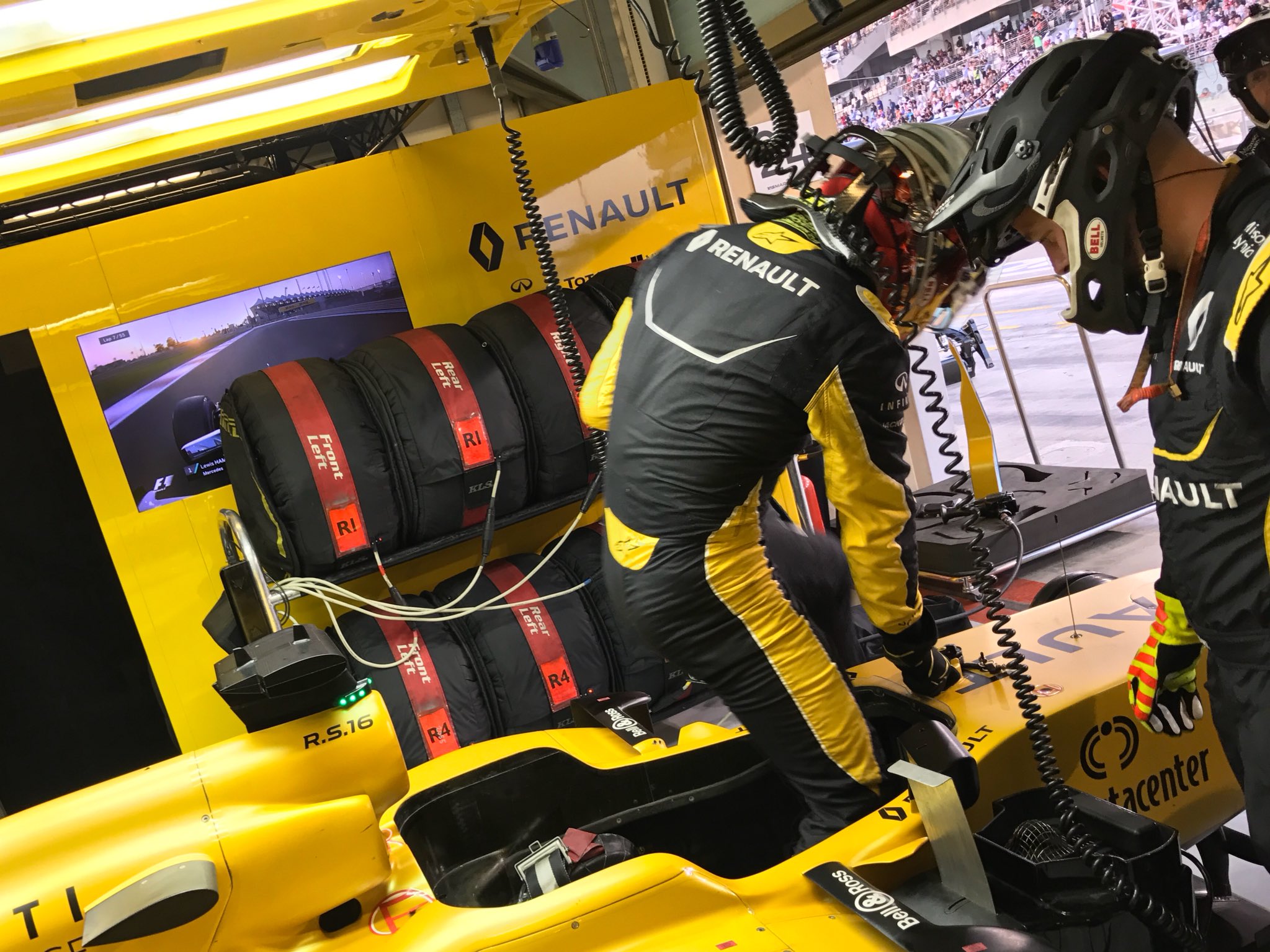 Магнуссен первым посещает боксы. Его болиду требуется небольшой ремонт.