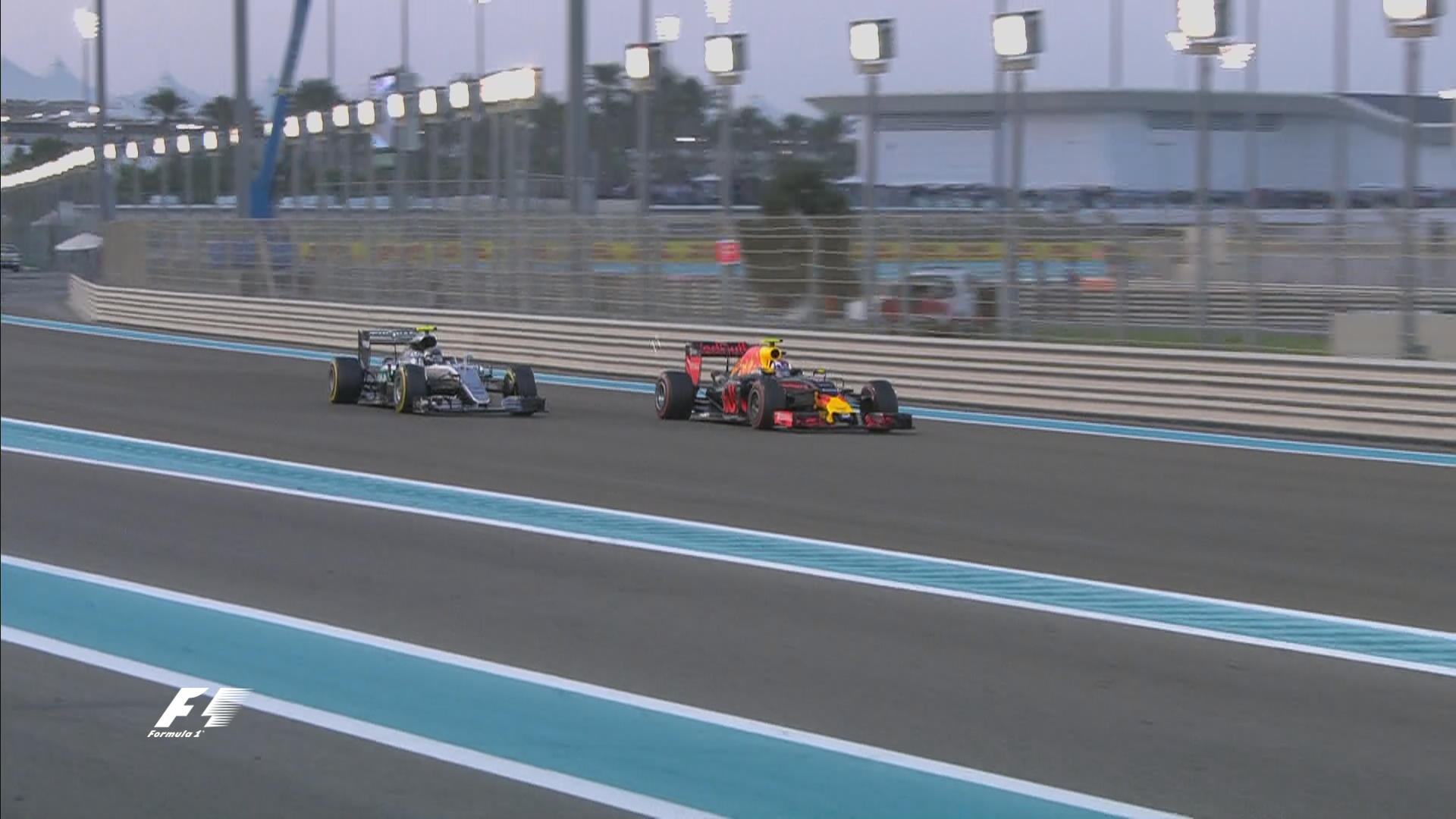 Росберг на новой резине пытается обогнать Ферстаппена на старых шинах. Не выходит.