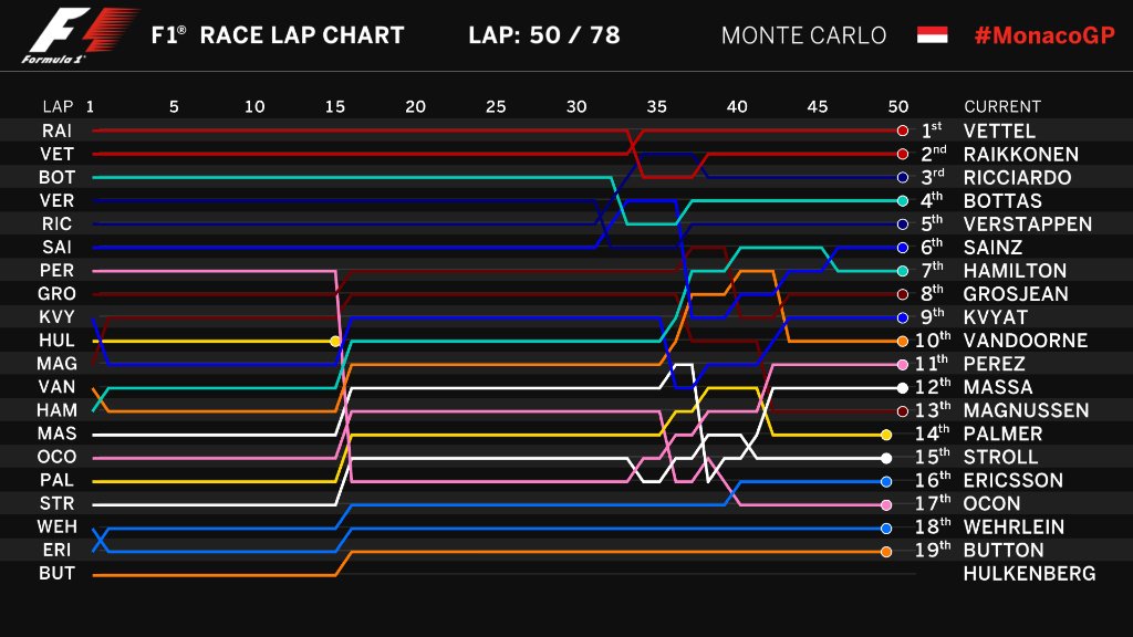 52-й круг: Риккьярдо проехал собственный лучший круг. Между ним и Кими менее четырех секунд.