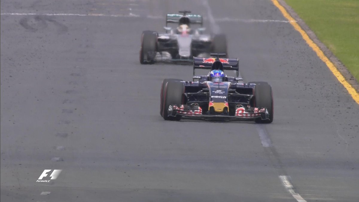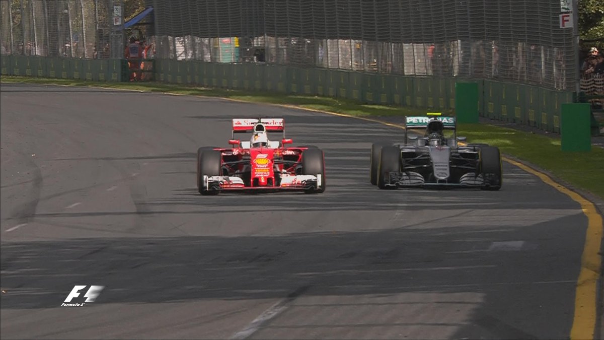 1-й круг. Вот это старт! Две "Феррари" прорываются вперед, оставляя "Мерседесы" позади! Мощь! Феттель - лидер, Райкконен - второй, далее - Росберг и Масса, а Хэмилтон лишь пятый!