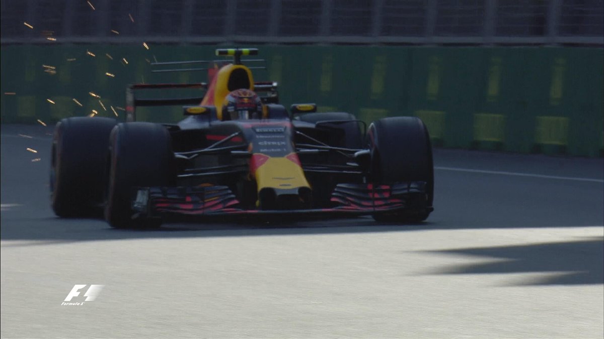 Ферстаппен слишком широко выходит из поворота и едва не разбивает машину - задевает он стену задним правым колесом, но остается на трассе. Опасно.