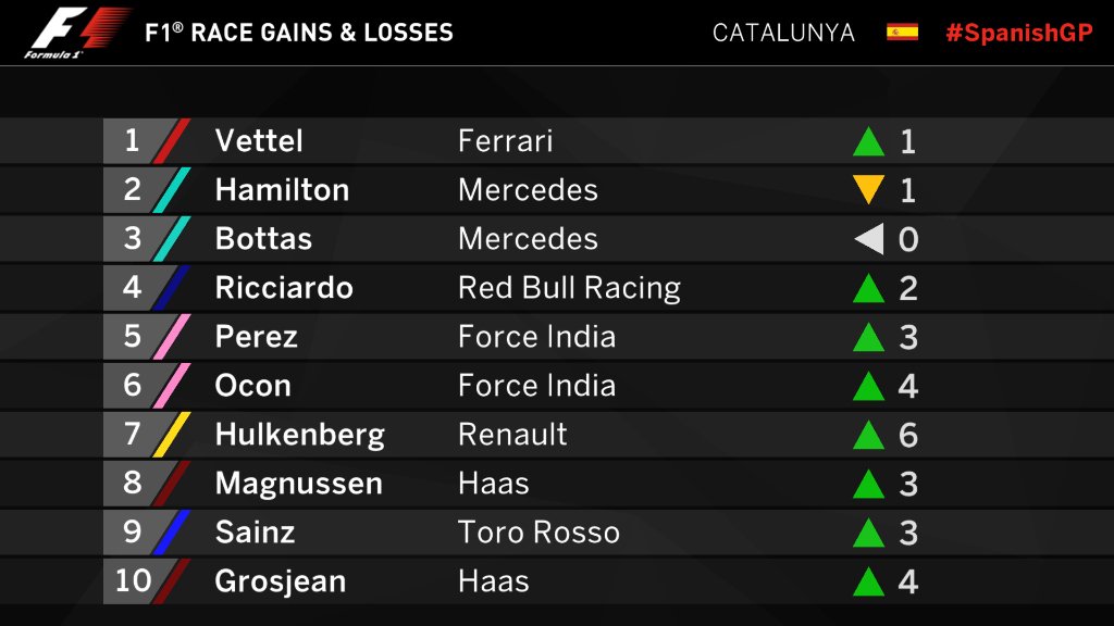 У Хэмилтона – хет-трик. Феттель – второй, Риккьярдо – третий. Далее расположились Перес, Окон, Хюлькенберг, Сайнс, Верляйн, Квят и Грожан.
