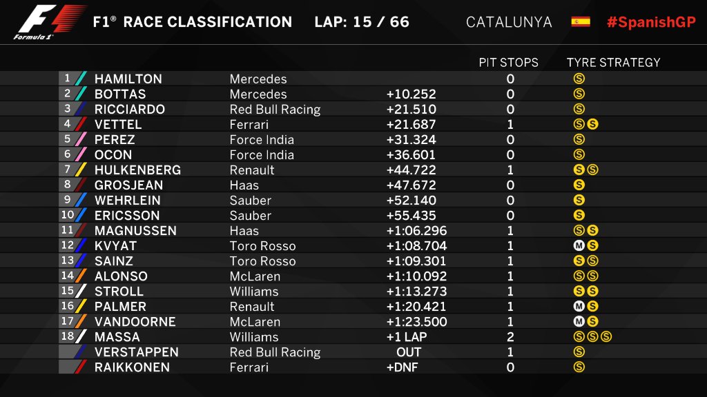 43-й круг: Хэмилтон проходит собственный лучший круг. 0,8 до Феттеля и почти минута до Риккьярдо.