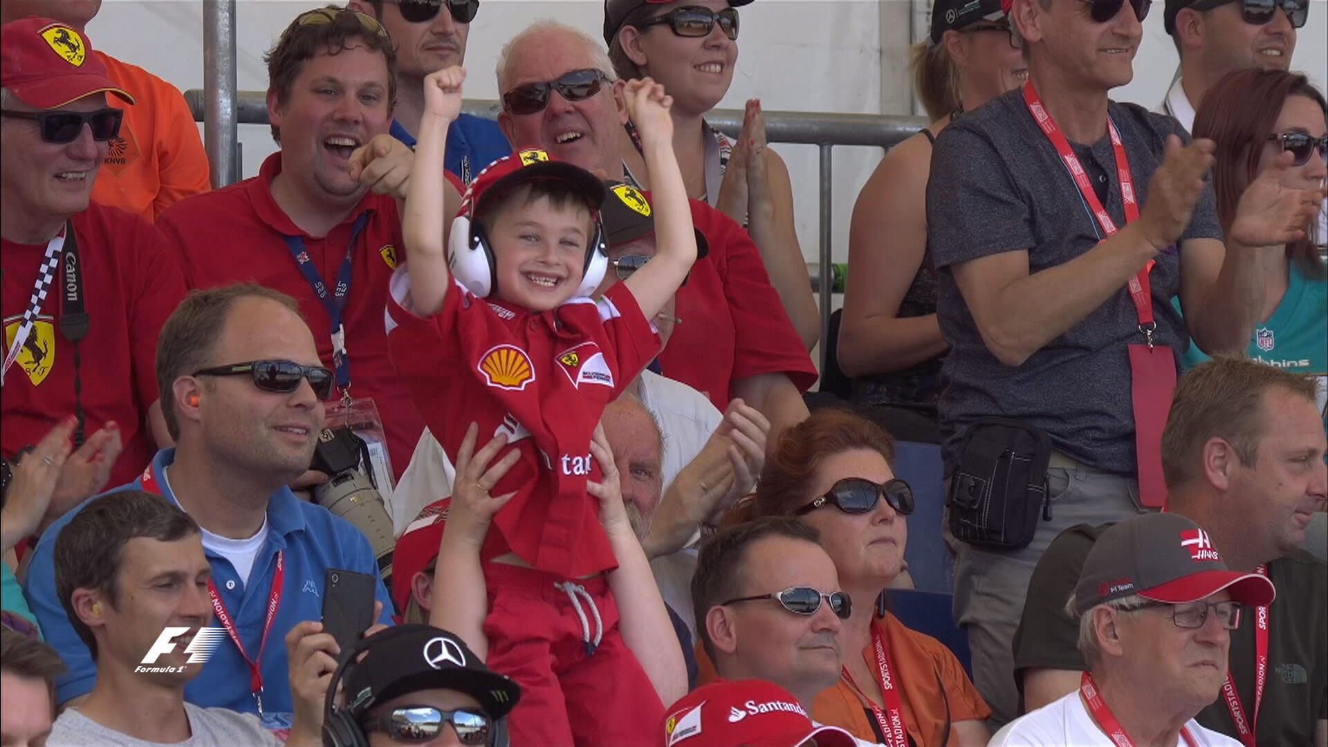 23-й круг: 0,4 секунды между Боттасом и Феттелем. Кажется, юный болельщик Райкконена рад лидерству другого финна.