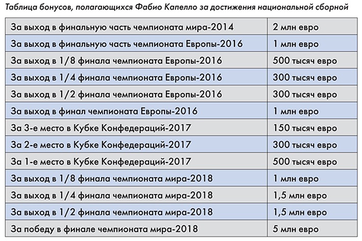 4 574 595 евро – получил Фабио Капелло за подготовку и выступления на ЧМ-2014, с 24 января по 25 июля 2014 года (в месяц 731 935 евро).