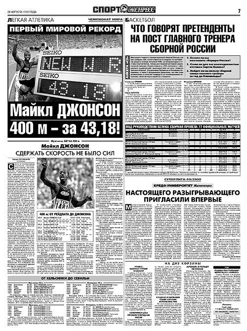 Участившиеся чемпионаты мира по легкой атлетике уже не вызывают прежнего ажиотажа. Вот и очередной, в Севилье, – очередной и есть. Проходит он большей частью буднично, а единственным событием, достойным внимания, становится очередной же – но теперь в положительном смысле – выдающийся мировой рекорд неподражаемого Майкла Джонсона на 200-метровке – 43,18!