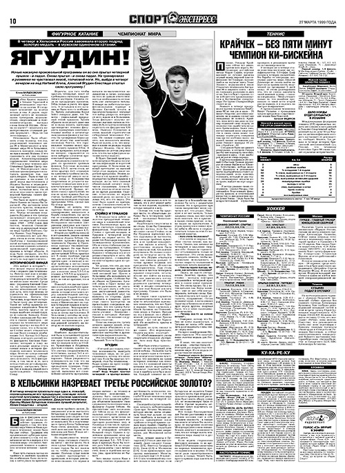 Невозможно было объяснить этому человеку, что год, разделивший чемпионат мира-98 в Миннеаполисе и чемпионат мира-99 в Хельсинки, оказался, наверное, самым тяжелым в жизни Ягудина. И что сравнивать эти два турнира нельзя. Комментировавший соревнования чемпион мира 1987 года и вице-чемпион двух Олимпиад Брайан Орсер сказал: «В Миннеаполисе сильнейшая группа фигуристов каталась примерно так, как здесь вторая». Была и еще одна причина: в последние 12 дней перед выступлением у Ягудина болела и периодически теряла чувствительность левая, толчковая нога. Но об этом не знал никто, кроме тренерской бригады, самого фигуриста и врача.