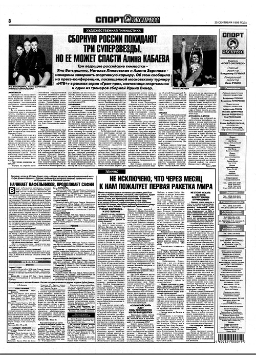 Кабаева - один из типичных примеров выдающегося тренерского чутья Винер. Говорят, что после первого просмотра Алины в Новогорске все специалисты пришли к выводу: абсолютно безнадежный случай. Все, кроме Винер, которая уже тогда заявила, что сделает из девочки чемпионку Олимпиады-2000. Тренер оказалась права - сейчас Кабаева считается чуть ли не единственной фавориткой Игр в Сиднее. Об этом свидетельствуют и результаты последних крупных турниров: помимо первенства Европы Алина выиграла Всемирные юношеские игры. Игры доброй воли и крайне престижный клубный чемпионат мира в Токио, то есть все наиболее значимые соревнования этого года.