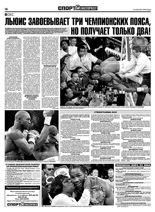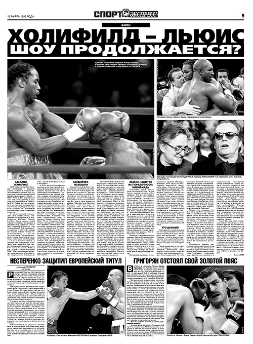 Весь год длится эпопея с объединительным боем за титул чемпиона мира в тяжелом весе. Владелец пояса WBC англичанин Леннокс Льюис намерен экспроприировать еще два, WBA и IBF, хранящиеся у американца Эвандера Холифилда. И как будто делает это в марте – но судьи чудят и присуждают ничью!