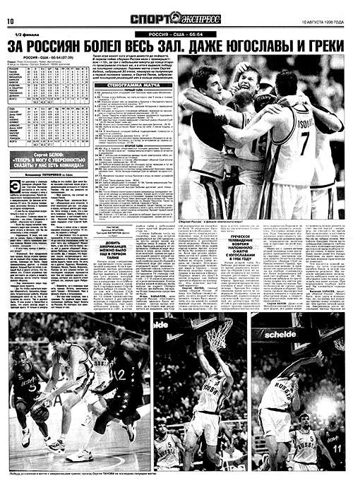 Игорь КУДЕЛИН, защитник сборной России: «Можете думать что угодно, но в душе я верил, что команда вытянет этот матч. Мы же растеряли преимущество и позволили американцам оторваться из-за своих промахов и глупых ошибок. К тому же накануне по местному телевидению очень кстати показали полуфинал чемпионата мира с югославами в 1986 году, когда наши на последней минуте 9 очков отыграли - напомнили, как это делается. Тогда у сборной СССР была 51 секунда, и они успели, а у нас-то времени оставалось гораздо больше».