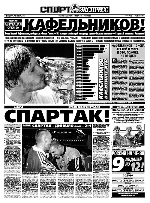Вновь на вершине славы теннисист Евгений Кафельников – теперь уже во всех отношениях. Рейтинг ATP от 3 мая впервые в истории мирового тенниса возводит на первую строку россиянина. Лидером – впереди Сампраса, Агасси, Риоса – Евгений пробудет шесть недель. А несколькими месяцами ранее Кафельников второй раз в карьере побеждает на турнире Большого шлема – в Австралии.