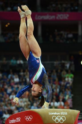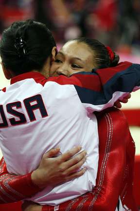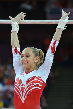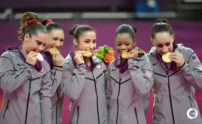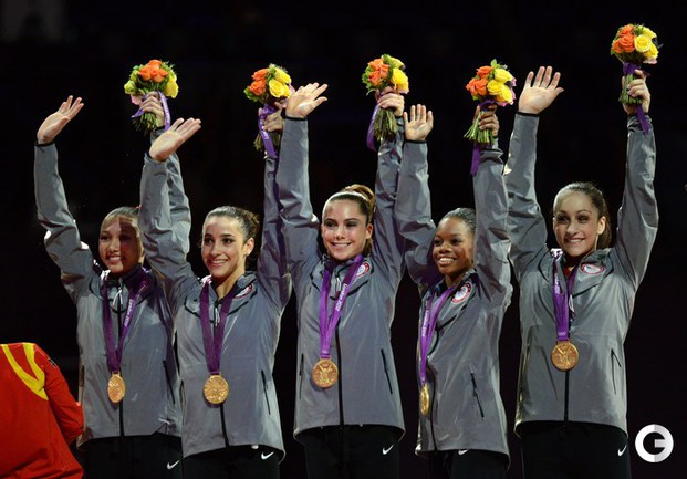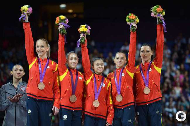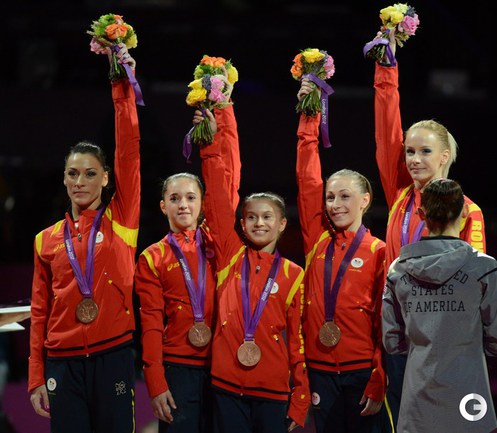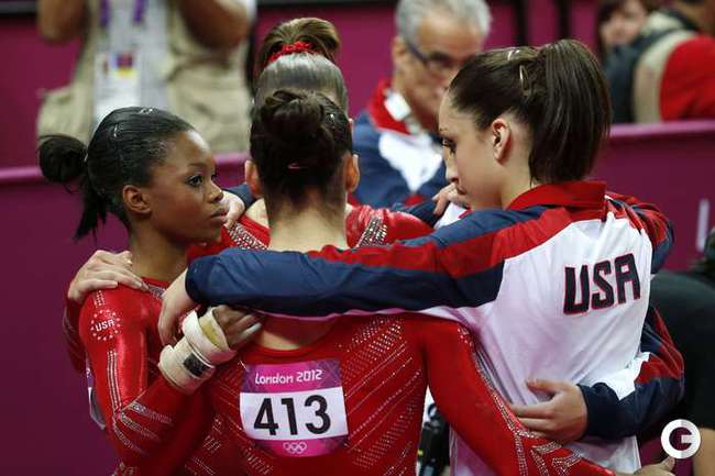 Спортивная гимнастика. Лондон. Олимпийские игры. Женщины. Командное первенство. 1. США (Уибер, Даглас, Росс, Рэйсман, Мэрони) - 183,596. 2. РОССИЯ (Афанасьева, Гришина, Комова, Мустафина, Пасека) - 178,530. 3. Румыния (Булимар, Келару, Иордаке, Избаса, Понор) - 176,414. Фото AFP