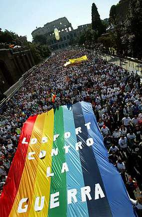 Состоявшийся сегодня в Риме марафонский забег превратился в грандиозную демонстрацию против войны в Ираке. Стартовав от Колизея, тысячи спортсменов пронесли по улицам итальянской столицы огромный транспарант, раскрашенный в цвета радуги. На гигантском куске материи было написано: "Спорт против войны". Добавим, что победителем соревнований стал кениец Федерик Чероно, показавший результат 2:08.47. |