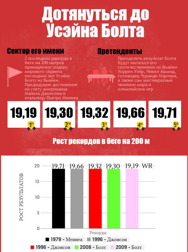 Смогут ли финалисты в 200-метровке на чемпионате мира в Москве замахнуться на рекорд ямайского спринтера Усэйна Болта, чье достижение – 19,19 сек. – вот уже четыре года является ориентиром в этом секторе легкоатлетической программы? Сможет ли претендовать на высшее достижение сам многократный олимпийский чемпион и чемпион мира?