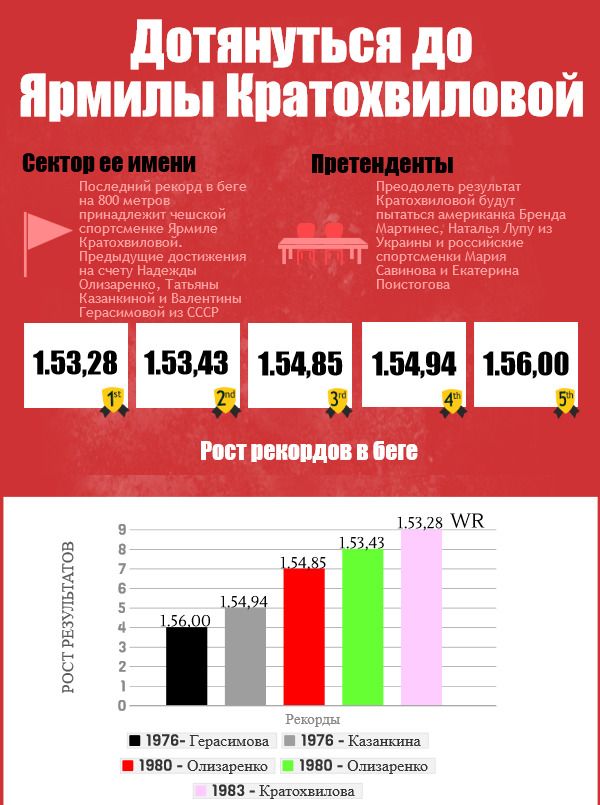 Смогут ли финалистки в 800-метровке на чемпионате мира в Москве замахнуться на рекорд Ярмилы Кратохвиловой из Чехии, чье достижение – 1.53,28 мин – вот уже 30 лет является ориентиром в этом секторе легкоатлетической программы? Сможет ли претендовать на высшее достижение олимпийская чемпионка Мария Савинова из России?