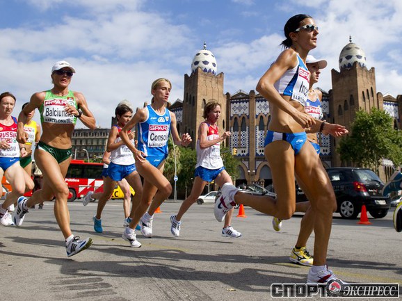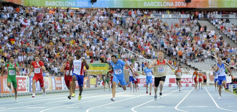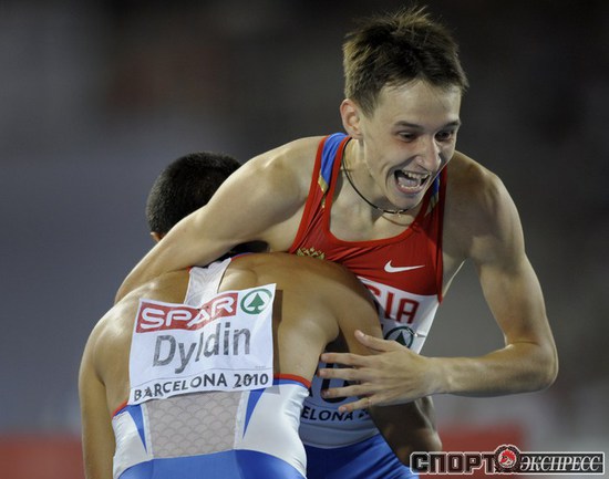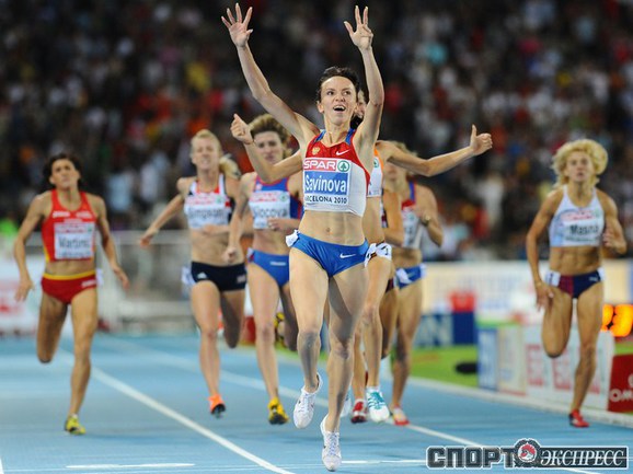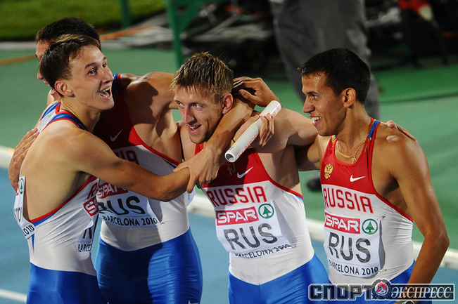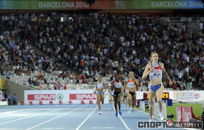 1.08.2010. Барселона. Чемпионат Европы. Россиянки Анастасия Капачинская, Антонина Кривошапка, Ксения Усталова, Татьяна Фирова завоевали золото в эстафете 4х400 - 3.21,26 (лучший результат сезона в мире). Фото AFP