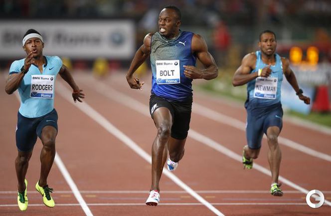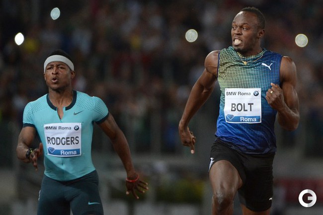 Легкая атлетика. Рим. Бриллиантовая лига. 5-й этап. Мужчины. 100 м. 1. Гэтлин (США) – 9,94. 2. Болт (Ямайка) – 9,95. 3. Вико (Франция) – 10,02. Шестикратный олимпийский чемпион, рекордсмен мира на дистанциях 100 и 200 метров Усэйн Болт уступил на стометровке Джастину Гэтлину в рамках пятого этапа "Бриллиантовой лиги". Фото AFP, REUTERS