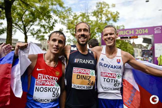 Цюрих. Чемпионат Европы. Ходьба. Мужчины, 50 км. 1. Диниз (Франция) – 3:32.33. 2. Тот (Словакия) – 3:36.21. 3. НОСКОВ – 3:37.41. 4. РЫЖОВ (оба – Россия) – 3:39.07. Фото AFP