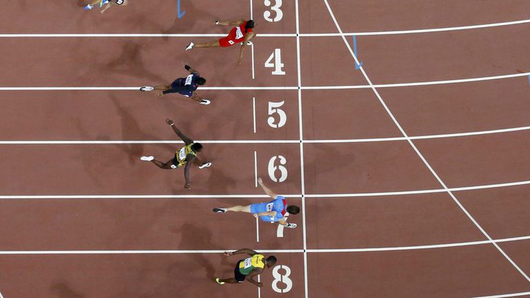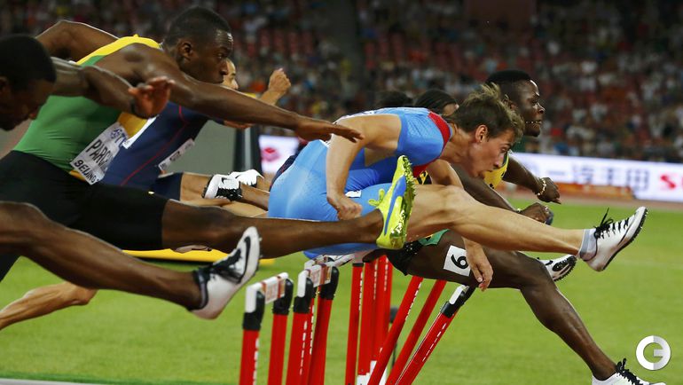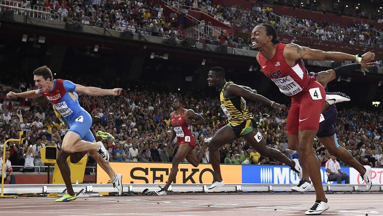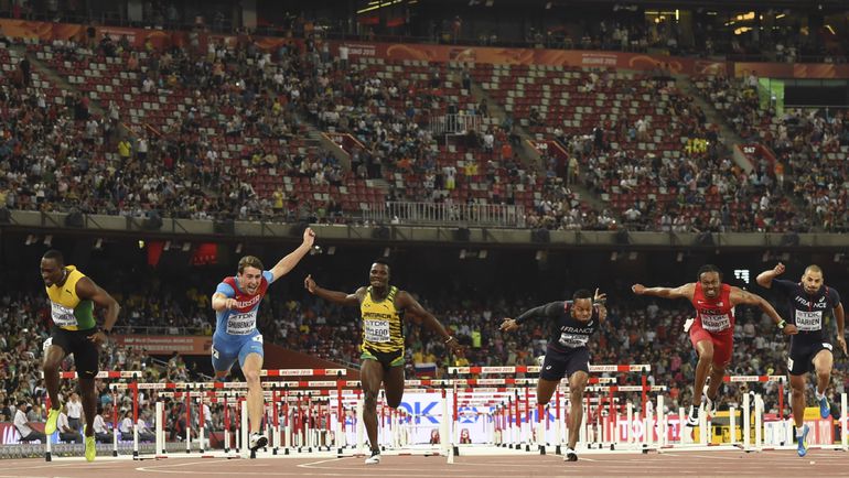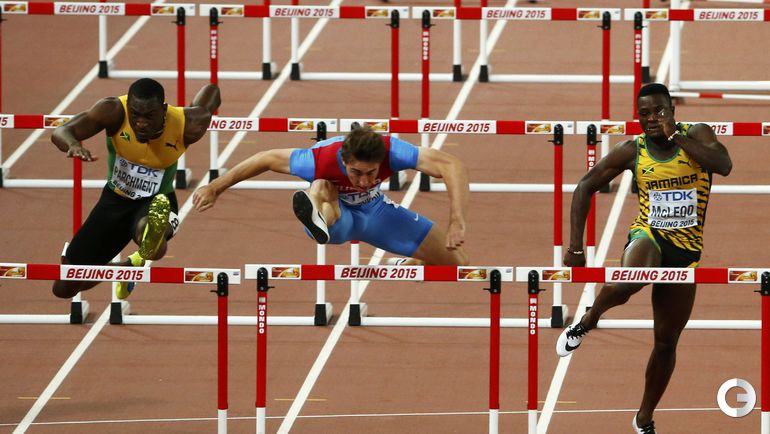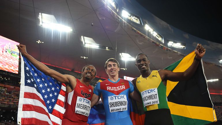 Пекин (Китай). Чемпионат мира. 110 м с/б. Мужчины. 1. ШУБЕНКОВ (Россия) - 12,98. 2. Парчмент (Ямайка) - 13,03. 3. Мерритт (США) - 13,04. Фото AFP, REUTERS