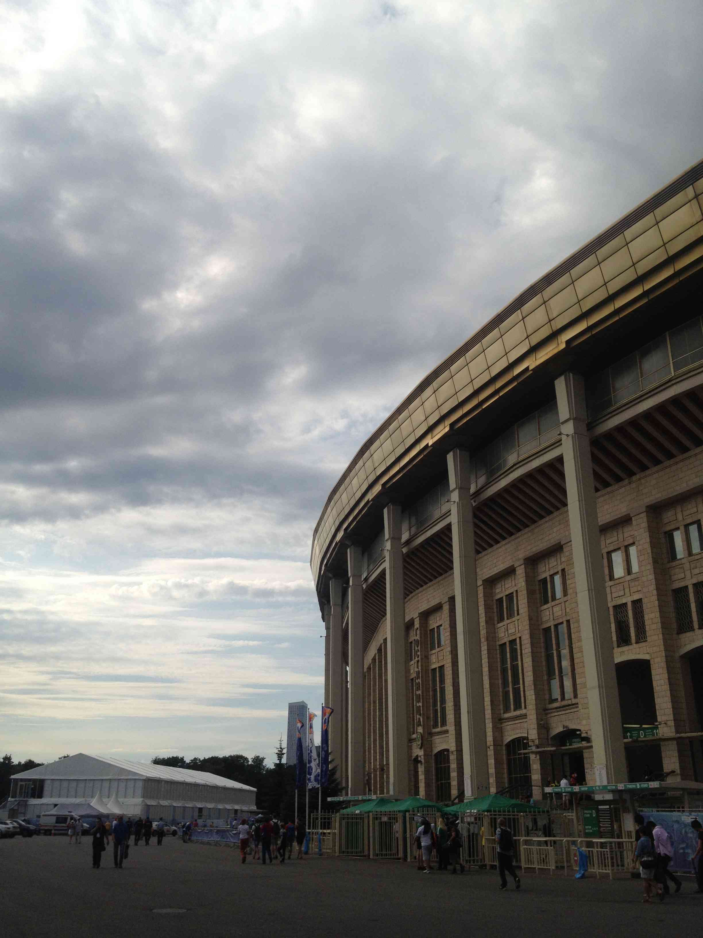 Над стадионом тучи и ветрено. Но дождем не пахнет. Болельщики неспешно гуляют по территории.