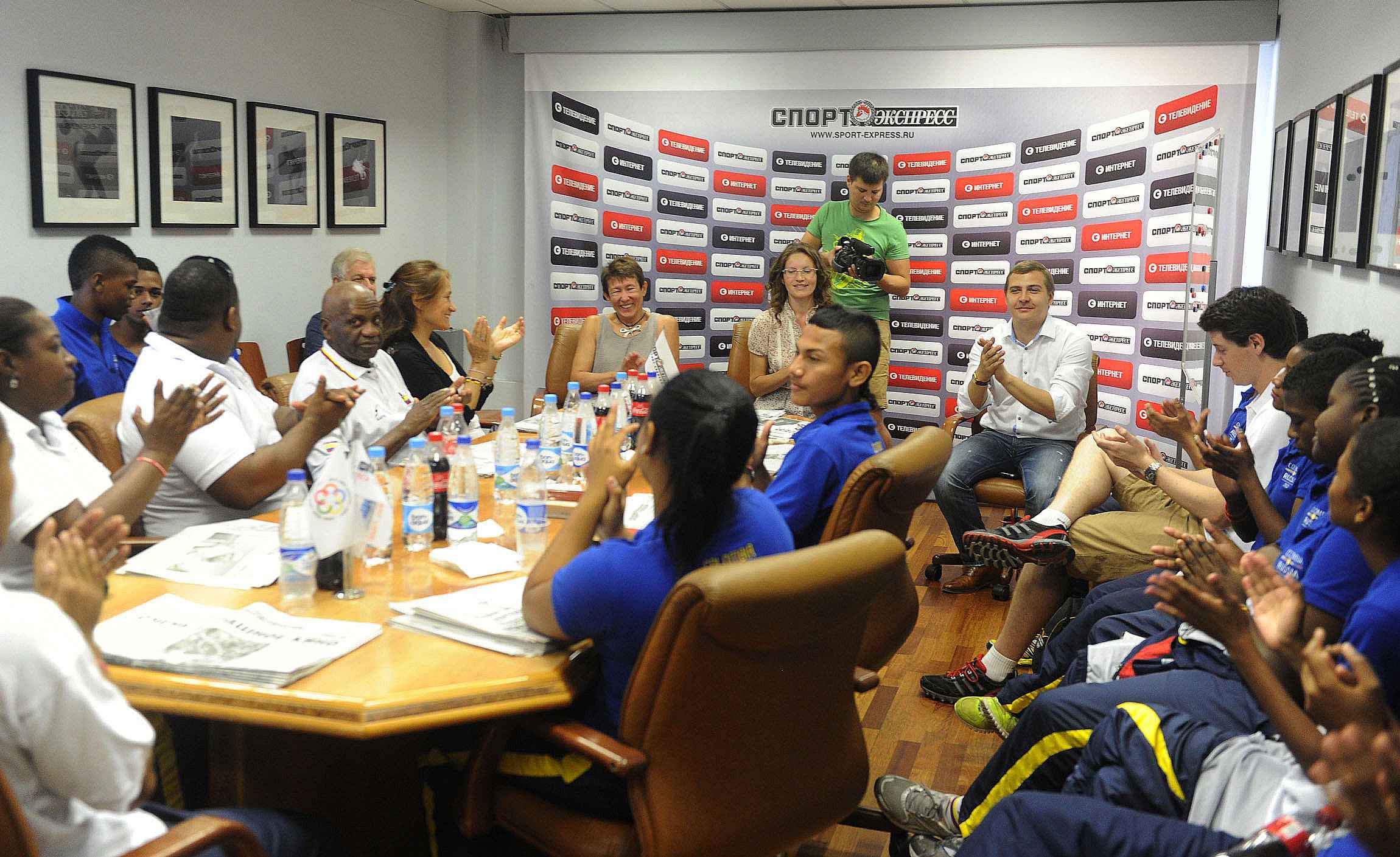 Чемпионат мира ворвался к нам в редакцию с самого утра. В гости к "СЭ" приехала делегация во главе с консулом посольства Колумбии в Москве Мэри Лосано. Почти два десятка молодых ребят из Колумбии на протяжении недели поддерживают свою сборную в Лужниках.