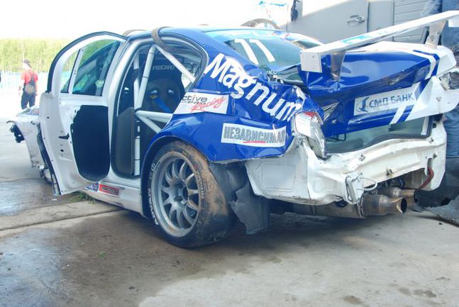 Повреждения машины Николаева оказались слишком серьезными, чтобы восстановить ее за ночь: "Тут запчастей нужно на миллион," - оценил ущерб возглавляющий команду Андрей Севастьянов. Автомобиль Степанова также пострадал серьезно: разбиты радиаторы, повреждена коробка передач, а главное - от удара были погнуты лонжероны, базовые силовые элементы кузова. Отправив одного из механиков в Москву за запчастями, команда занялась восстановлением геометрии кузова. С помощью тросов зафиксировав автомобиль относительно стен боксов, механики начали выправлять лонжероны с помощью кувалд. И кстати, по словам пилота, простота методики никак не сказалась на результате: восстановленный автомобиль в воскресенье управлялся ничуть не хуже, чем "целый" в суботу.