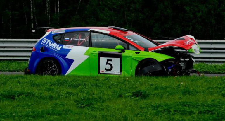 А вот механики команды Storm Motorsport не ложились спать вовсе. Два пилота этого коллектива вели между собой красивую борьбу за третье место и в какой-то момент не поделили выход из первого поворота. Войдя в него по внешнему радиусу, уступив сопернику более удобную внутреннюю сторону, Андрей Николаев красиво "перекрестил траекторию" и раньше смог начать разгон. За счет этого на прямой после поворота спортсмен оказался в более выгодной позиции, так как набрал более высокую скорость и смог опередить своего товарища по команде Михаила Степанова. Но чтобы занять идеальную траекторию, надо было сместиться чуть левее - и Николаев начал смещаться, не понимая, что еще не до конца обогнал оппонента. На скорости около 140 км/ч оба автомобиля SEAT Leon сцепились и столкнулись с железным отбойником.