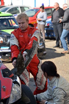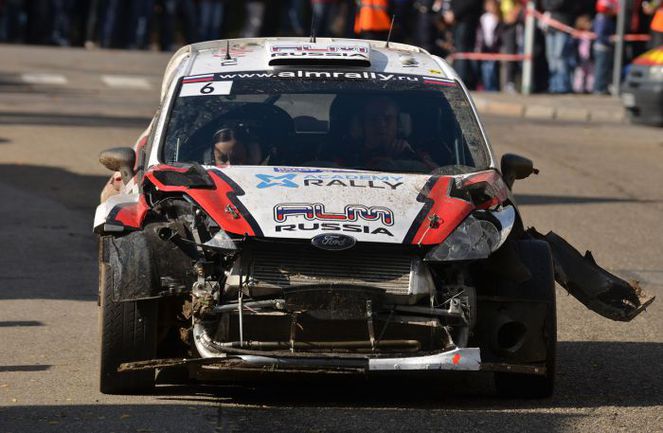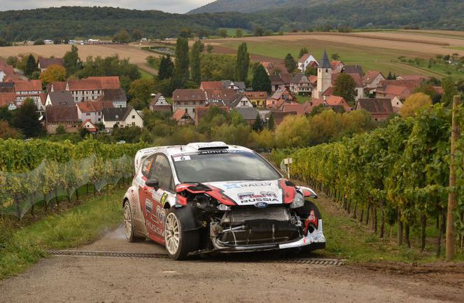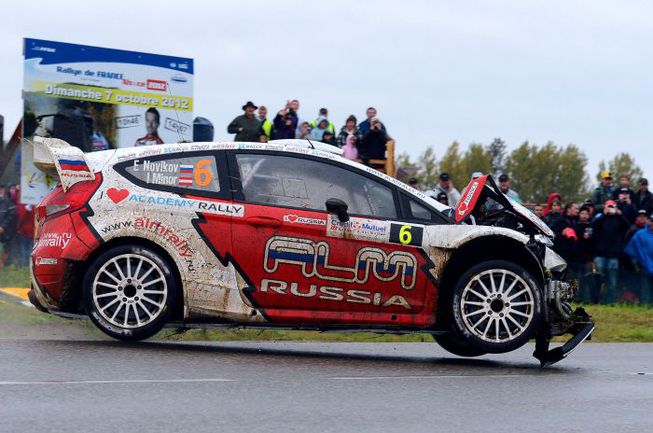 К сожалению, "Ралли Франции" не обошлось без инцидентов для Евгения Новикова. На этой гонке россиянин выступал без экипажа-разведчика, который незадолго до старта проезжает по спецучастку и докладывает основному экипажу о факторах риска - к примеру, о больших лужах или поворотах, где на асфальте особенно много песка и грязи. Особенно важна работа разведчика в дождливую погоду - поэтому неудивительно, что именно под дождем, который пошел в воскресенье утром, Новиков стал ошибаться - хотя перед этим проехал 16 спецучастков без серьезных проблем. Первый инцидент случился на первом же воскресном допе Виньобль де Клебур (17 км, средняя скорость победителя - 103 км/ч): в быстром правом повороте москвич не удержал свой Ford Fiesta RS на дороге - но оперативно вернулся обратно, "скосив" некоторое количество растущей на близлежащем поле кукурузы.