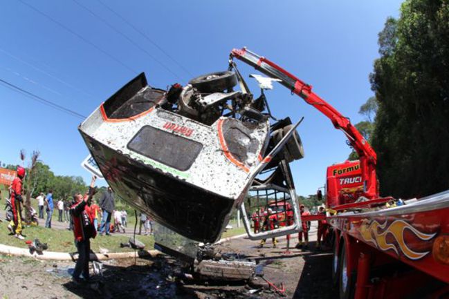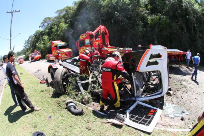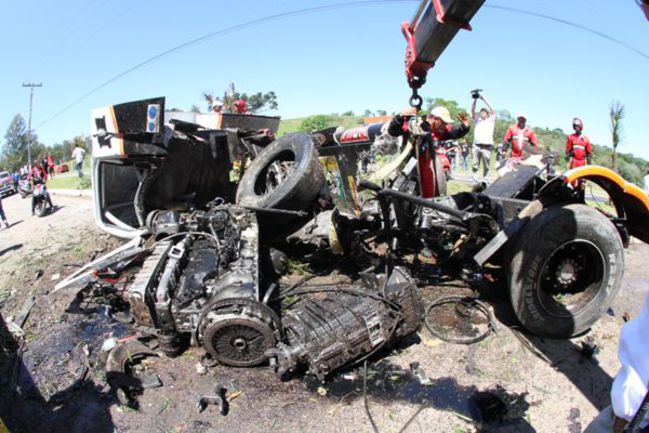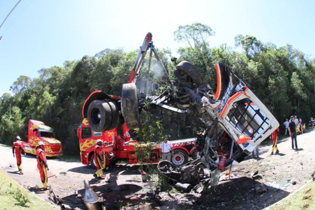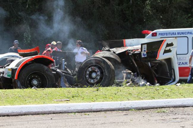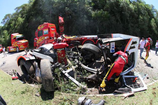 Если при рассказе об инциденте на спецучастке Ронде не мог удержаться от улыбки даже его виновник, то на трассе в бразильском городе Гуапоре участникам, организаторам и зрителям субботней гонки чемпионата "Формула-Трак" было совсем не до веселья. В один из моментов заезда 50-летний бизнесмен Дьюмар Буэно понял, что на его 5-тонном гоночном грузовике "Вольво" (чей мотор развивает под 1000 л. с.) отказали тормоза. Вместо того чтобы замедлиться перед очередным поворотом, машина продолжала разгоняться (к моменту вылета с трассы развила скорость 184 км/ч), пробила ограждение и остановилась только на проложенной по территории автодрома подъездной дороге, съехав сквозь лесополосу вниз по откосу высотой 15 метров. Пилота доставили в больницу с несколькими переломами - к счастью, его жизнь вне опасности, а никто из зрителей или обслуживающего персонала трассы по ходу этого инцидента не пострадал.