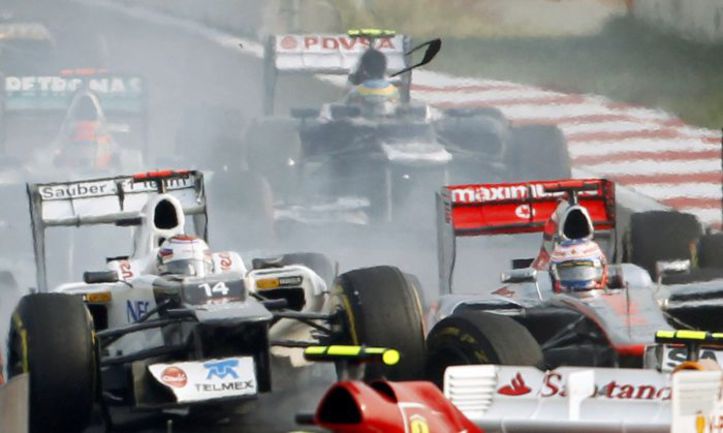 На фоне столь разрушительной аварии происшествие на первом круге гонки "Формулы-1" в Южной Корее выглядит вполне безобидным - хотя выбитые из борьбы пилоты произнесли по адресу заварившего кашу соперника несколько недобрых слов. Виноват во всем оказался Камуи Кобаяси - тот самый пилот "Заубера", который ровно неделю вызвал всеобщий восторг и уважение, финишировав третьим на домашней гонке в Сузуке. Складывается ощущение, что ехавший в плотной толпе японец пропустил точку торможения, не увидев за другими болидами тех ориентиров, к которым привязывался на тренировках и квалификации. Между тем перед вторым поворотом трассы в Йонаме торможение нешуточное: с 315 км/ч надо сбросить скорость примерно до 100. "Мы ехали бок о бок с Нико Росбергом, оба тормозили весьма поздно - и тут откуда ни возьмись прилетел Камуи, каким-то образом успев зацепить нас обоих", - рассказал об инциденте Дженсон Баттон, который был вынужден сойти с трассы из-за повреждений передней подвески на своем "Макларене".