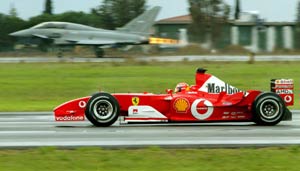 Сегодня на одной из военных баз Италии состоялось любопытное соревнование. Болид "Феррари", управляемый чемпионом мира Михаэлем Шумахером, состязался в скорости с итальянским самолетом-истребителем "Еврофайтер Тифон", который пилотировал летчик Маурицио Кели. Соревнование включало три заезда - на 600, 900 и 1 200 метров, и Шумахеру удалось взять вверх только на самой короткой дистанции. По окончании необычного состязания немец назвал гонки с самолетом "интересным опытом".