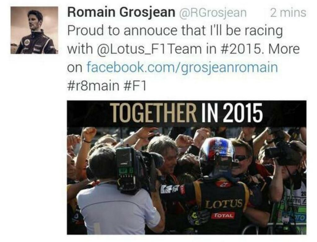 "Пилот" Лотуса Ромэн Грожан в своем твиттере опубликовал сообщение, что он остается в команде на следующий сезон. Француз написал: он горд, что будет выступать за "Лотус" в 2015 году. Правда, через несколько минут это сообщение было удалено.