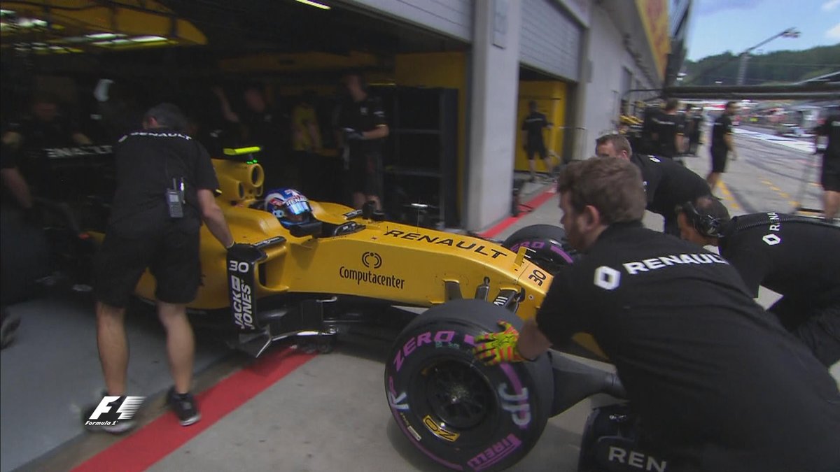 Первым на трассу выехал Палмер. Следом за ним из боксов показались Сайнс, Верляйн, Магнуссен и Хэмилтон.