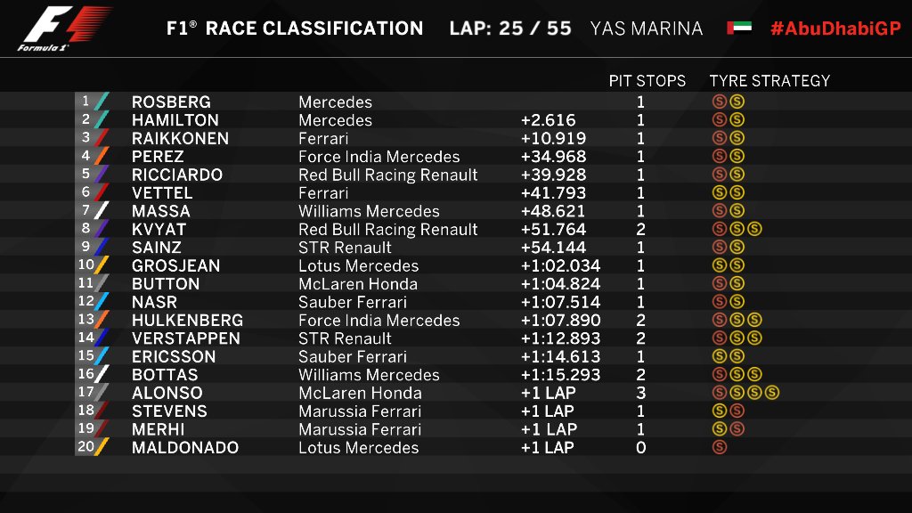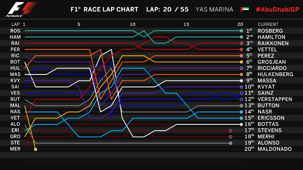 20-й круг: Росберг идет первым с преимуществом в 5,8 секунды. Квят несется в 0,42 секунды от Массы.
